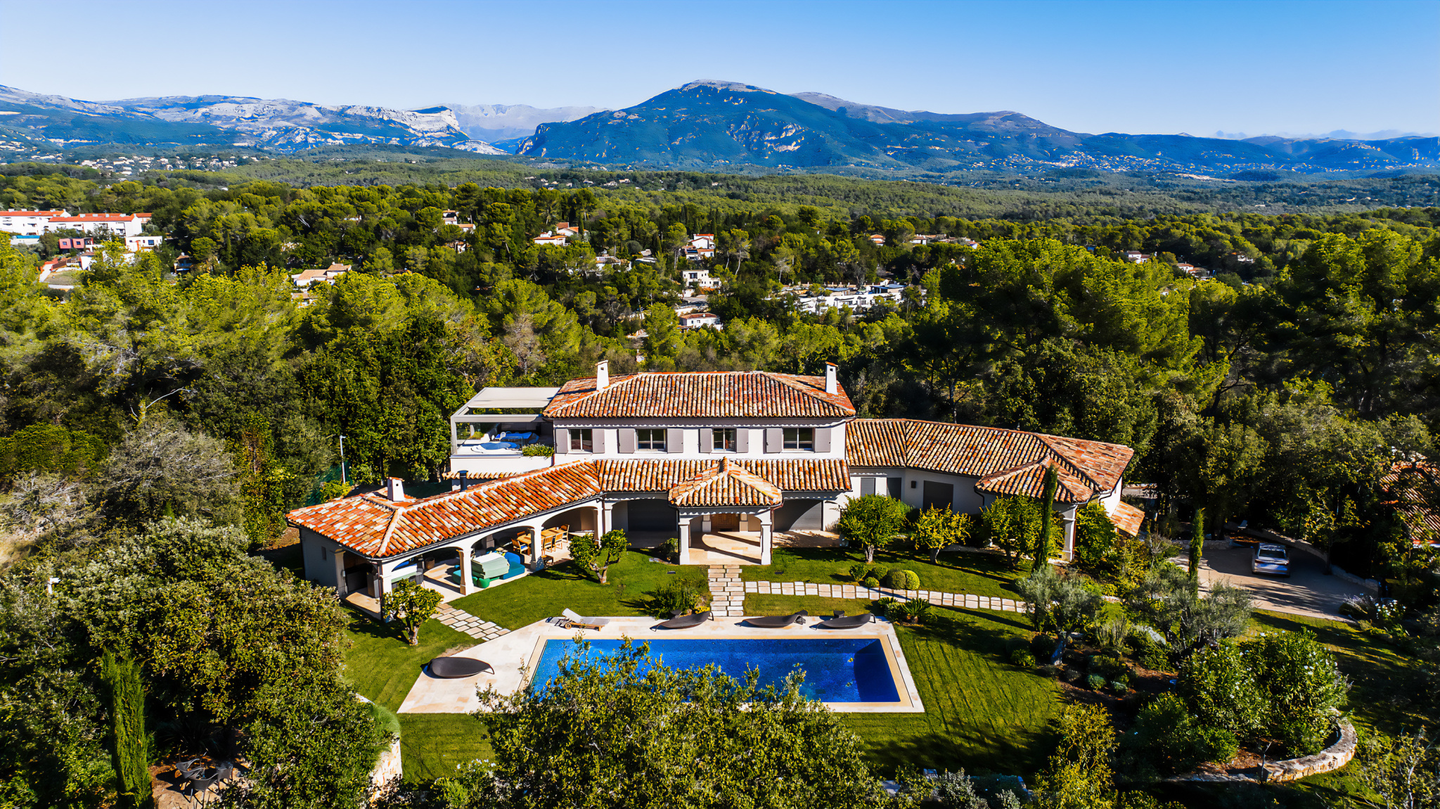 En exclusivité : Implantée au cœur de 1,35 hectare de parc privé, au sein d’un domaine sécurisé dans un secteur résidentiel prisé de Valbonne, cette exceptionnelle propriété offre un cadre de vie incomparable, alliant calme absolu et totale intimité. En lisière du Parc de la Valmasque, la propriété bénéficie d’une vue dégagée sur les Gorges du Loup et d’un accès piéton direct aux sentiers forestiers protégés ainsi qu’à la rivière de la Brague. Entièrement rénovée et achevée en 2021, la villa s’étend sur un terrain paysager d’environ 13 500 m² . Elle séduit par ses volumes généreux, offrant près de 400 m² de surface habitable, complétés par environ 300 m² de dépendances , des prestations raffinées et de vastes espaces extérieurs baignés de soleil, pensés pour une utilisation tout au long de l’année. Les jardins exposés plein sud s’organisent autour d’une piscine miroir chauffée avec volet roulant, sublimée par une mosaïque sur mesure. Un pool house avec sanitaires et terrasse couverte constitue un élégant espace de vie extérieur, idéal pour les repas à l’ombre et les réceptions. Le parc paysager comprend également un terrain de pétanque, une douche extérieure, un éclairage d’ambiance, un système d’arrosage automatique ainsi que des dispositifs anti-moustiques discrets installés en périphérie de la propriété. Répartie sur trois niveaux et desservie par un ascenseur, la villa propose des espaces intérieurs élégants et harmonieusement agencés. Elle comprend un vaste salon de réception avec cheminée à gaz, un cozy salon vitré à ossature bois avec cheminée à foyer ouvert, ainsi qu’une cuisine entièrement équipée avec îlot central ouvrant sur la salle à manger. La propriété dispose de cinq chambres en suite, dont l’une est actuellement aménagée en bureau, ainsi qu’une pièce supplémentaire modulable pouvant accueillir une salle de jeux ou un espace de loisirs. Le niveau inférieur abrite un garage souterrain de 108 m² pouvant accueillir plusieurs véhicules, ainsi qu’un espace bien-être et loisirs comprenant une salle de sport, un sauna avec douches, une cave à vin et une buanderie, avec les pré-équipements déjà prévus pour l’installation future d’un hammam. Le confort moderne est assuré par un chauffage au sol dans toute la villa, la climatisation, Internet starlink, une domotique avancée (CrestronGo, Sonos…) et un système de sécurité complet. À la fois élégante et chaleureuse, parfaitement intégrée à son environnement naturel, cette propriété rare offre une qualité de vie exceptionnelle. Idéalement située à seulement 2 km (environ 5 minutes) du centre du village de Valbonne, à 15 minutes de Mougins et à moins de 30 minutes (16 km) d’Antibes, elle constitue un cadre idéal pour une résidence familiale de prestige ou un refuge d’exception sur la Côte d’Azur. Les informations sur les risques auxquels ce bien est exposé sont disponibles sur le site Géorisques